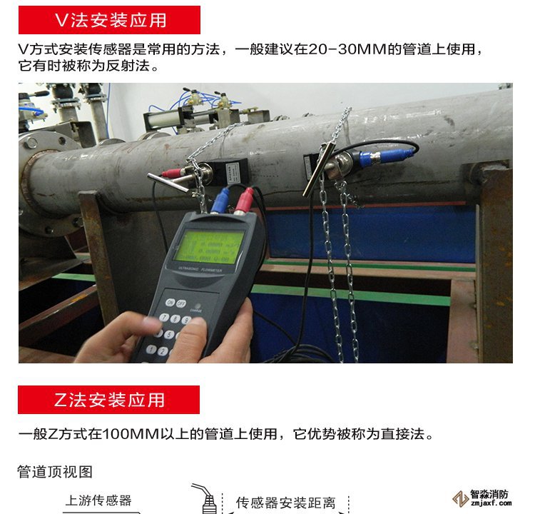 先將傳感器與主機相接,紅色傳感器接于上游端子,藍色傳感器放于下游端子。然后將兩個磁性傳感器與所測流量的管道連接,若不能相吸引,則采用支架將傳感器固定。固定好后打開主機輸入管道材質、直徑、傳感器距離,流體性質等相應的參數,即可開始測量。