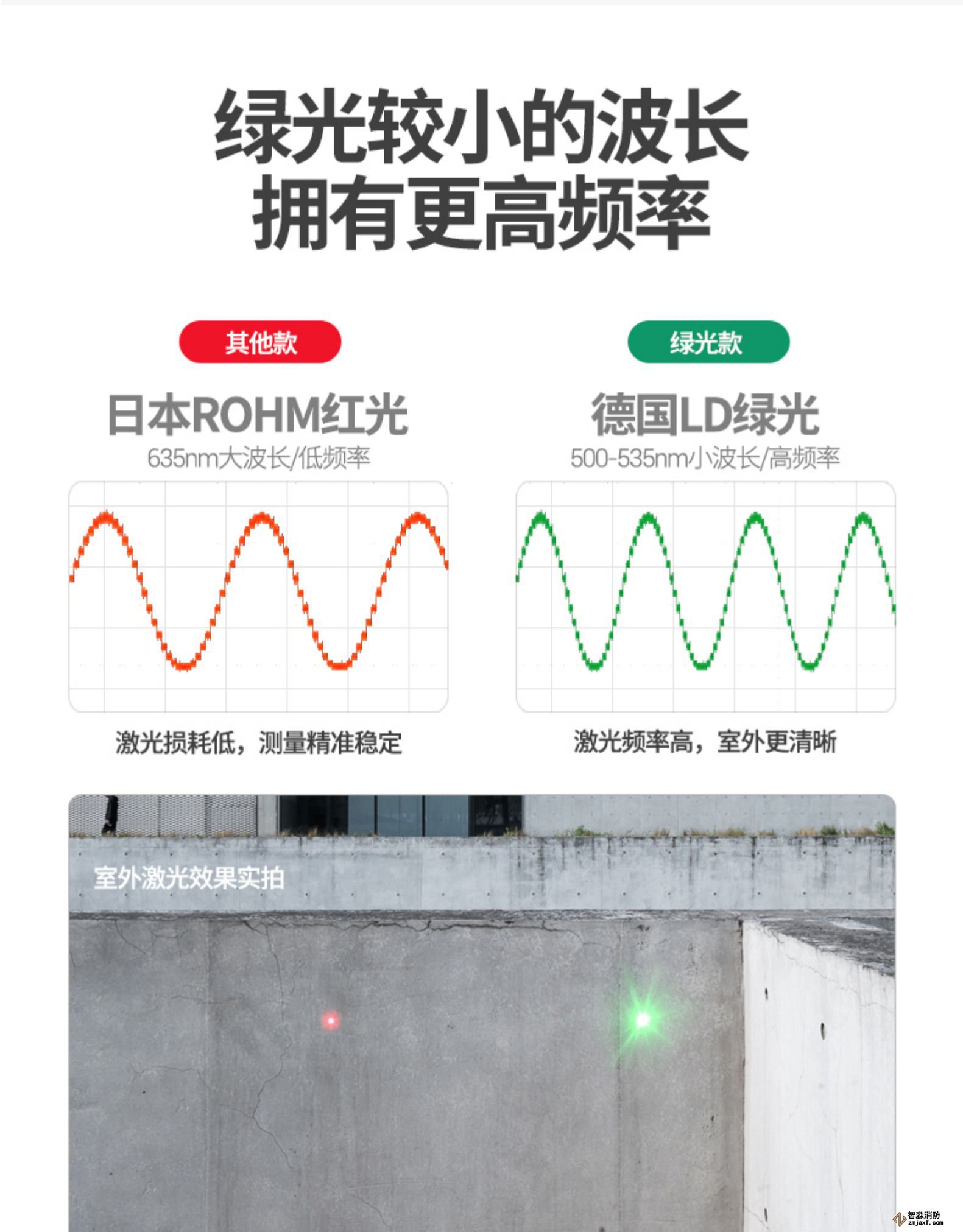 將激活的激光瞄準目標區域;輕按“測量”鍵;設置測量距離。設備立即顯示結果。