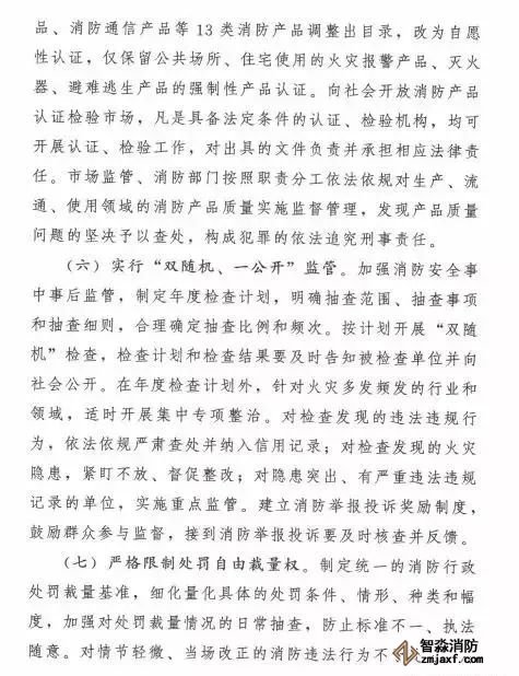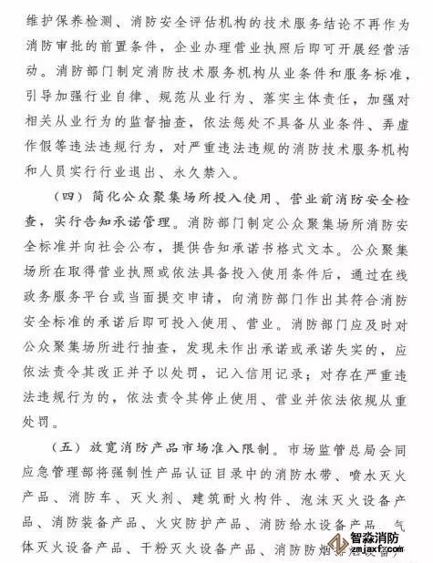 在簡政放權方面,取消和精簡3項消防審批。一是取消消防技術服務機構資質許可,取消消防設施維護保養檢測、消防安全評估機構資質許可制度,企業辦理營業執照后即可開展經營活動。二是簡化公眾聚集場所投入使用、營業前消防安全檢查,實行告知承諾管理,公眾聚集場所作出其符合消防安全標準的承諾后即可投入使用、營業。三是放寬消防產品市場準入限制,將強制性產品認證目錄中的13類消防產品調整出目錄,改為自愿性認證,僅保留公共場所、住宅使用的火災報警產品、滅火器、避難逃生產品的強制性產品認證;向社會開放消防產品認證、檢驗市場,凡是具備法定條件的認證、檢驗機構,均可開展認證、檢驗工作。消防部門制定消防技術服務機構從業條件和服務標準、公眾聚集場所消防安全標準,引導加強行業自律、規范從業行為,加強監督抽查,依法懲處違法違規行為,對嚴重違法違規的實行行業退出、永久禁入或者責令停止使用、營業。