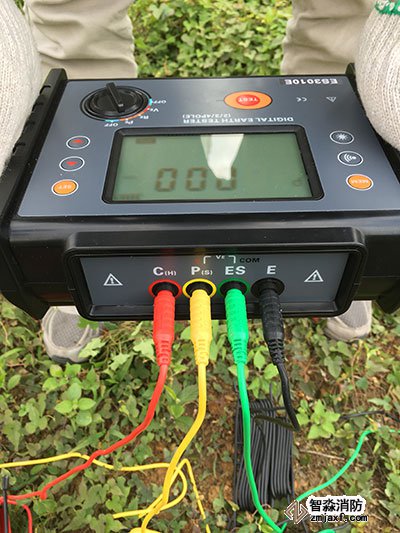 把接地棒打到土壤下,線上有鉗子的一端鉗住接地棒,還要再打三根接地棒。共:紅,黃,綠,黑四根線。接地線的按照H,S,ES,E順序成一直線排列,每個接地棒之間距離為5米