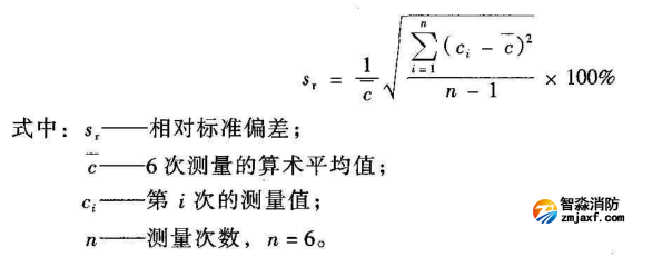 分析儀校準(zhǔn)零點(diǎn)后,分別通人約為滿量程80%的標(biāo)準(zhǔn)氣體,待示值穩(wěn)定后,得到測(cè)量值ci。然后回零,上述步驟重復(fù)6次,重復(fù)性以相對(duì)標(biāo)準(zhǔn)偏差、r表示,各參數(shù)的sr均可按公式(2)分別計(jì)算。