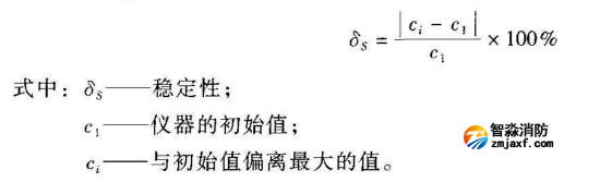 分析儀校準(zhǔn)零點(diǎn)后,通入約為量程80%的標(biāo)準(zhǔn)氣體,分別讀取穩(wěn)定示值c1,作為儀器的初始值。讓儀器連續(xù)運(yùn)行1h,每間隔15min通人一次標(biāo)準(zhǔn)氣體,同時(shí)讀取穩(wěn)定示值ci。每種標(biāo)準(zhǔn)氣體讀取穩(wěn)定示值4次,取與初始值偏離最大的值ci。按公式(3)計(jì)算穩(wěn)定性δs.